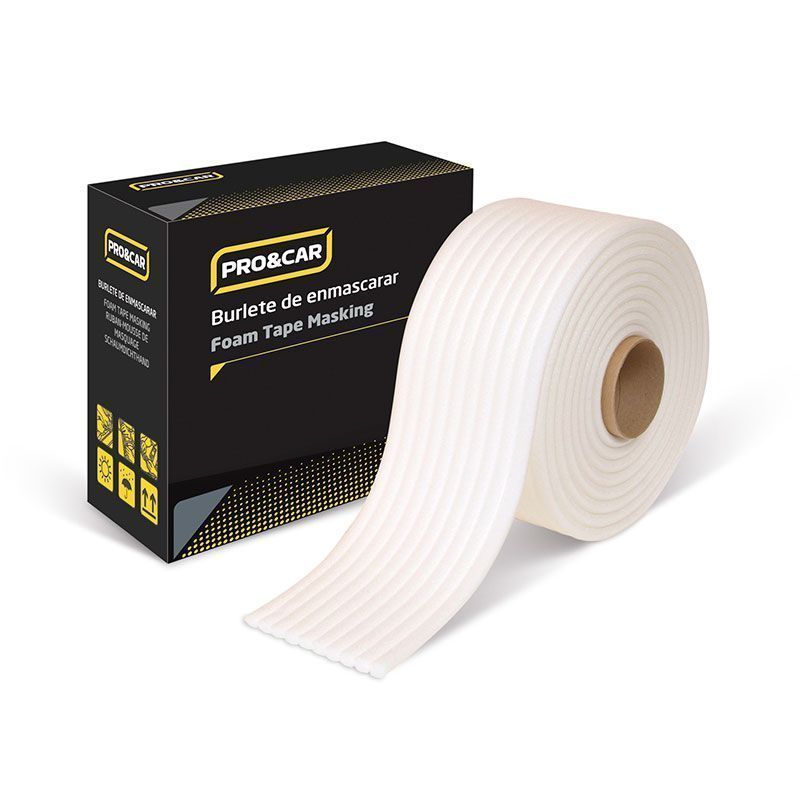 El Burlete de Enmascarado Blanco de PRO&CAR es una cinta de espuma flexible y autoadhesiva diseñada para sellar juntas de puertas y ventanas durante procesos de reparación y pintado de vehículos. Disponible en anchos de 13 mm y 19 mm, evita la entrada de aparejos, barnices y pinturas, garantizando un acabado limpio y profesional.