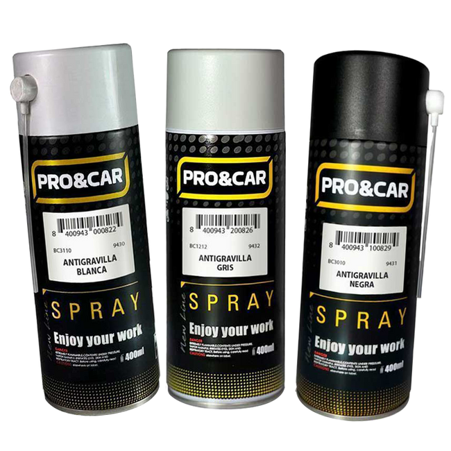 Los Sprays de Antigravilla PRO&CAR crean una capa elástica y resistente que protege eficazmente zonas expuestas como bajos, pasos de rueda y estribos. Su formato en aerosol permite una aplicación rápida, uniforme y cómoda, garantizando una defensa duradera contra golpes, humedad y corrosión.